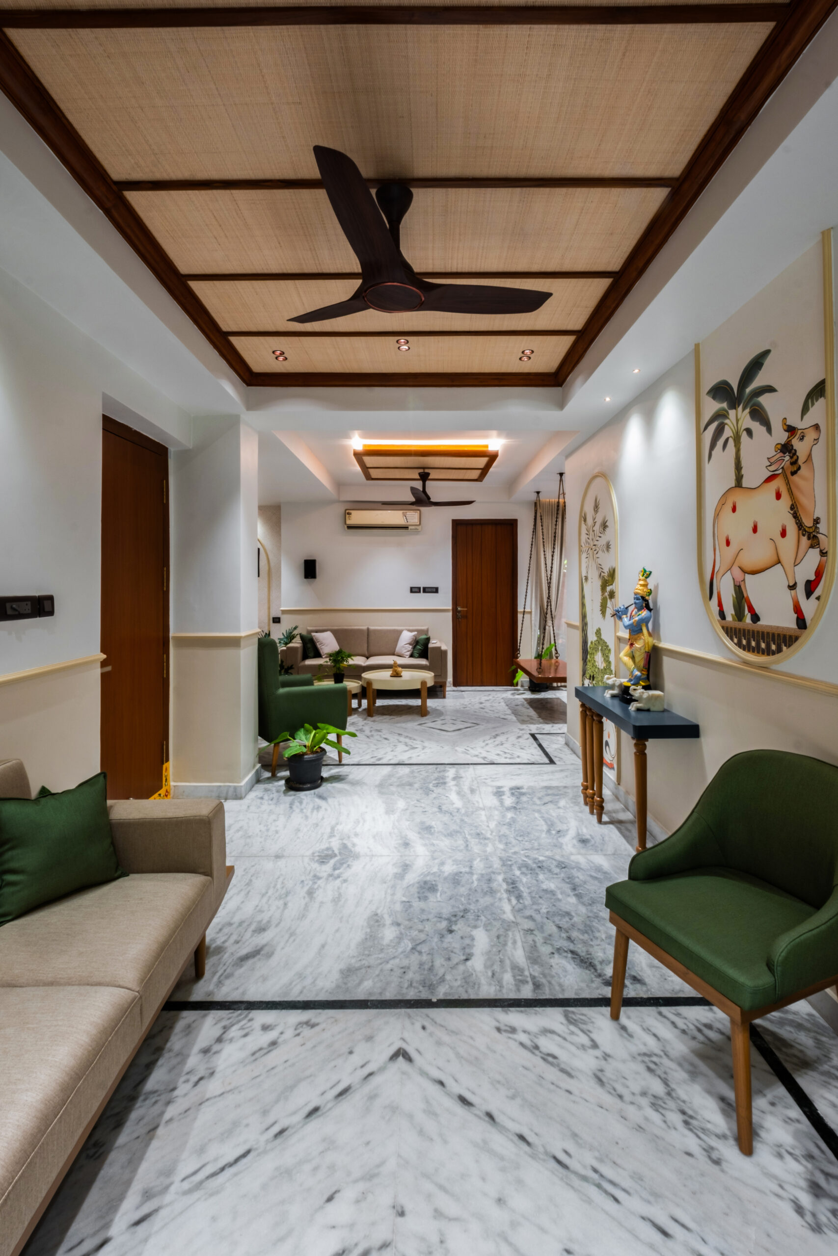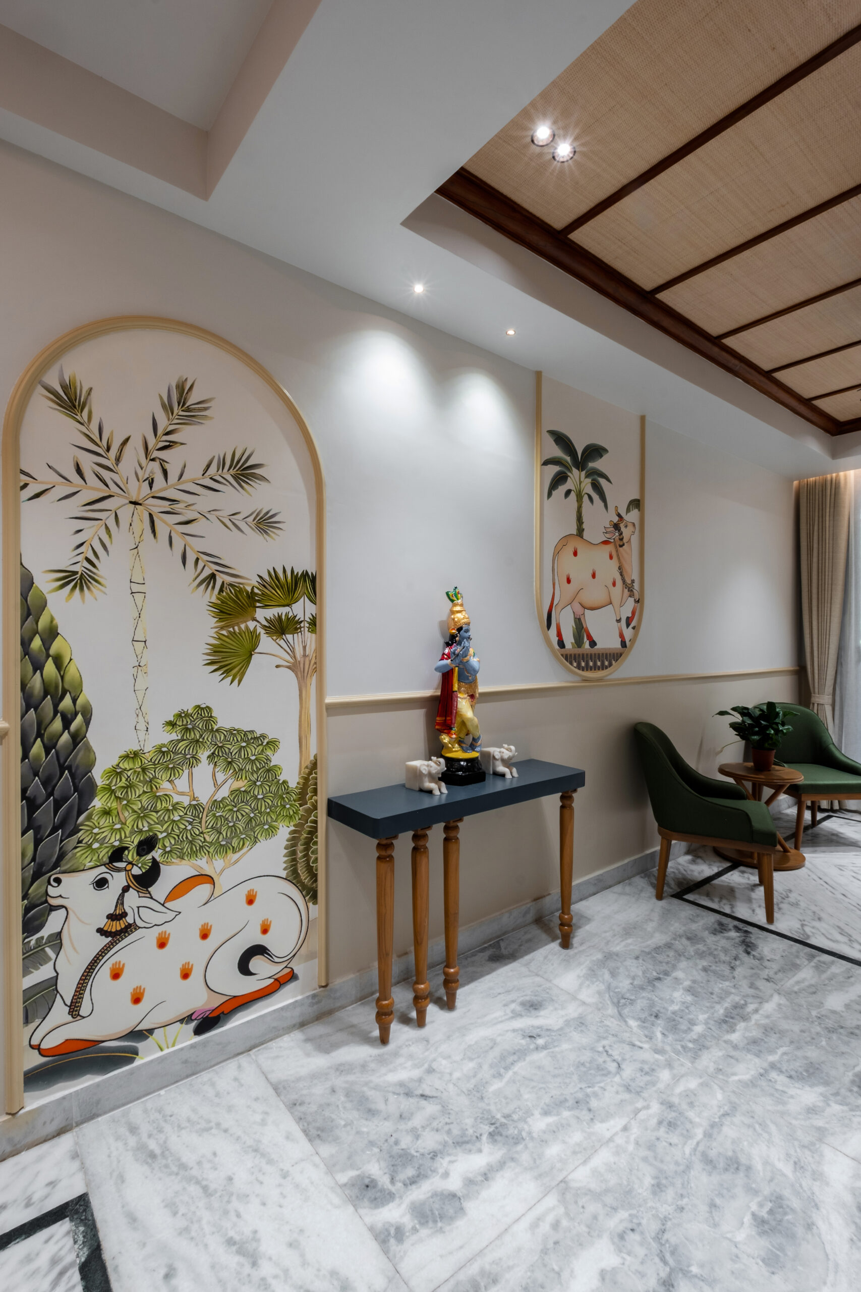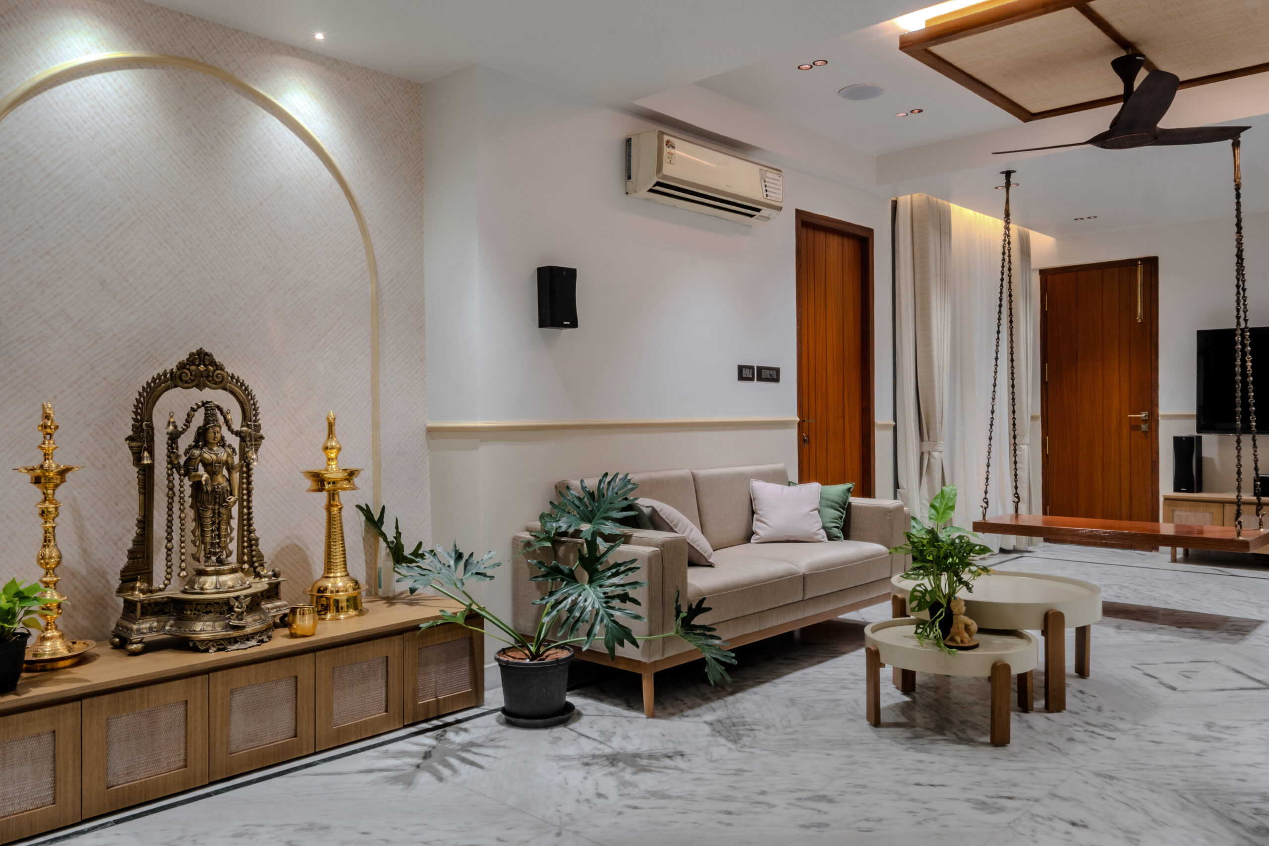 Our client—an accomplished doctor and a long-time patron—wanted her parents’ home to feel familiar, practical, and comfortable, while showcasing their cherished Indian collectibles. The challenge was to celebrate these antiques without overcrowding the limited space, and to weave them into a timeless, welcoming aesthetic.